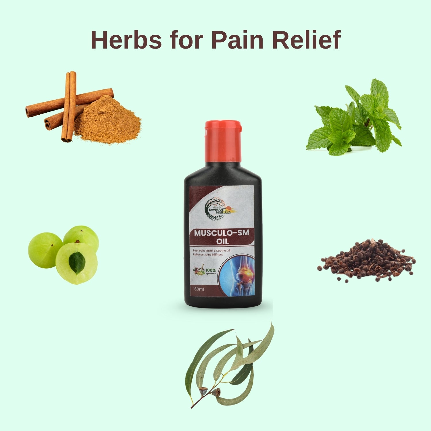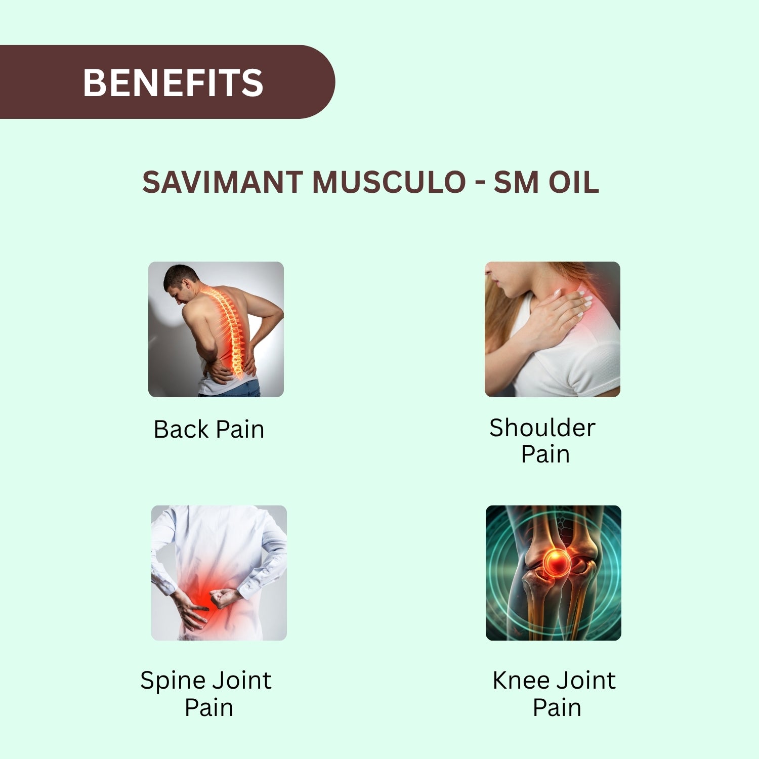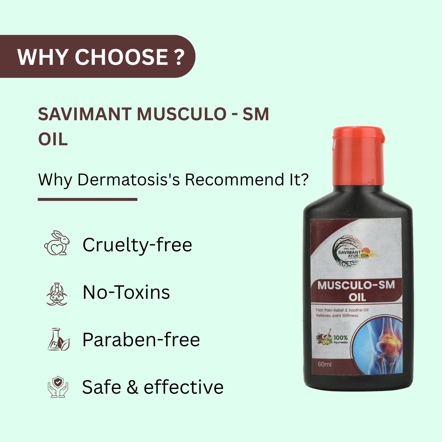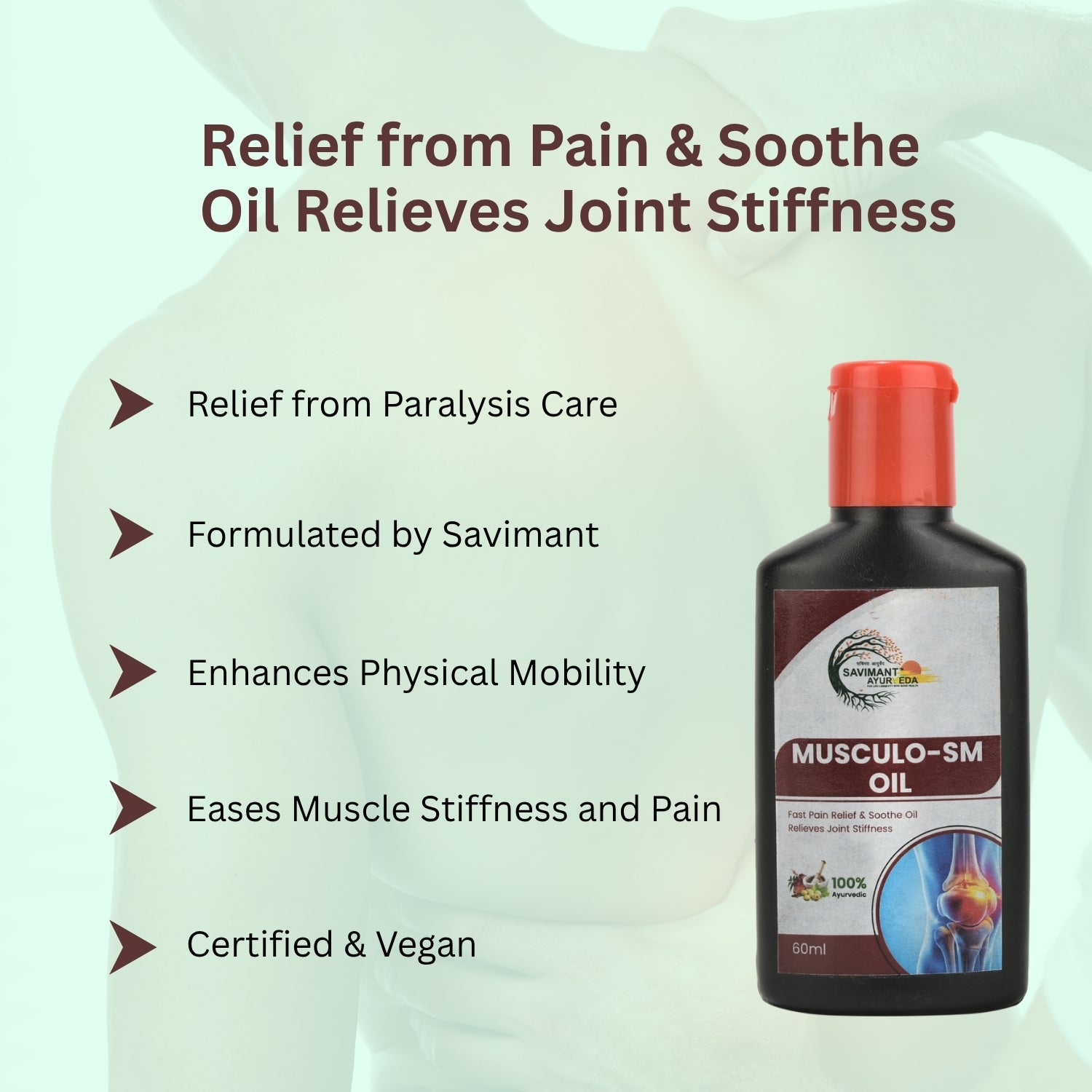 Musculo SM Oil is a powerful Ayurvedic pain relief oil designed to give you fast and effective relief from everyday body pains. Packaged in a 60ml bottle, this herbal medicated oil is ideal for those suffering from joint stiffness, muscle soreness, arthritis pain, and backache. Enriched with time-tested natural ingredients, it penetrates deep into the affected areas, reducing inflammation, improving flexibility, and promoting long-lasting comfort. This soothing oil works as an excellent muscle pain oil, offering quick relief after physical activity, sports injuries, or long working hours. Its non-sticky and lightweight texture ensures easy absorption, making it suitable for daily massage without any greasy feeling. Regular application not only relieves pain but also enhances blood circulation, relaxes tired muscles, and helps in faster recovery from stiffness and swelling. Perfect for both men and women, Musculo SM Oil can be used as a joint pain oil, arthritis relief oil, or a body massage oil to keep muscles and joints flexible. For best results, apply the oil directly on the affected area and massage gently twice a day. If you are looking for an effective Ayurvedic solution for muscle pain, joint stiffness, and arthritis discomfort, Musculo SM Oil is the trusted choice. Stay active, move freely, and experience natural pain relief with every massage.