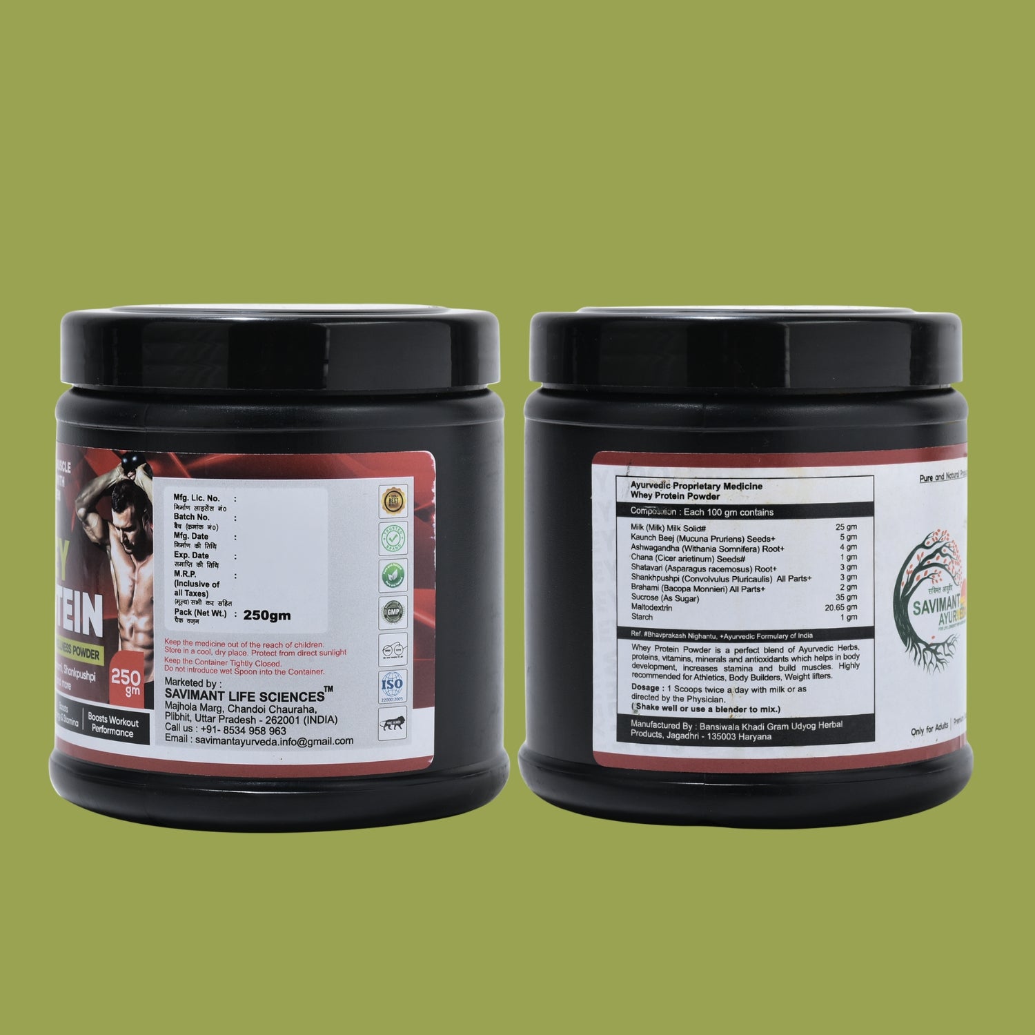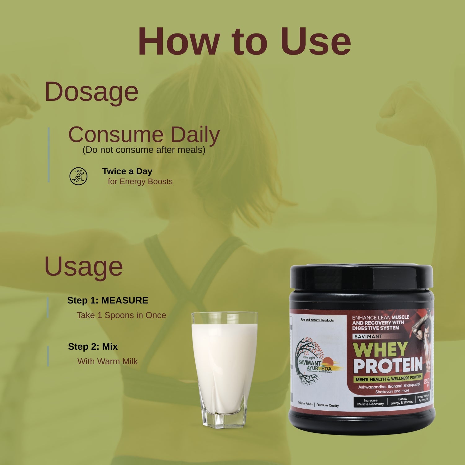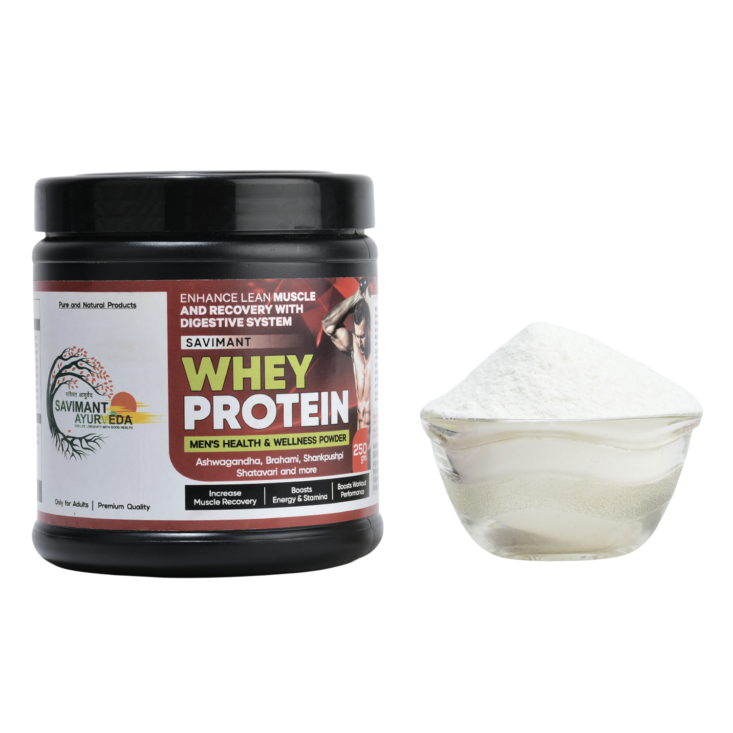 Boost your fitness journey with our premium Men's Health & Wellness Whey Protein Powder, specially formulated to support muscle growth, stamina, and overall wellness. This advanced formula combines high-quality protein with a potent blend of Ayurvedic herbs, including Ashwagandha, Brahmi, Shankhpushpi, Shatavari, and more, to enhance physical and mental performance. Packed with essential vitamins, minerals, and antioxidants, it promotes muscle development, aids in post-workout recovery, and strengthens immunity. Ideal for bodybuilders, athletes, and fitness enthusiasts, this whey protein powder supports healthy weight gain, improves endurance, and helps maintain bone health. Easy to consume, just mix 1 scoop twice daily with milk or water for optimal results. Experience the perfect synergy of modern nutrition and ancient Ayurvedic wisdom in every serving, giving you a natural, effective, and holistic approach to achieving your fitness goals. Make this protein powder an essential part of your daily routine for sustained energy, improved focus, and visible muscle gains.