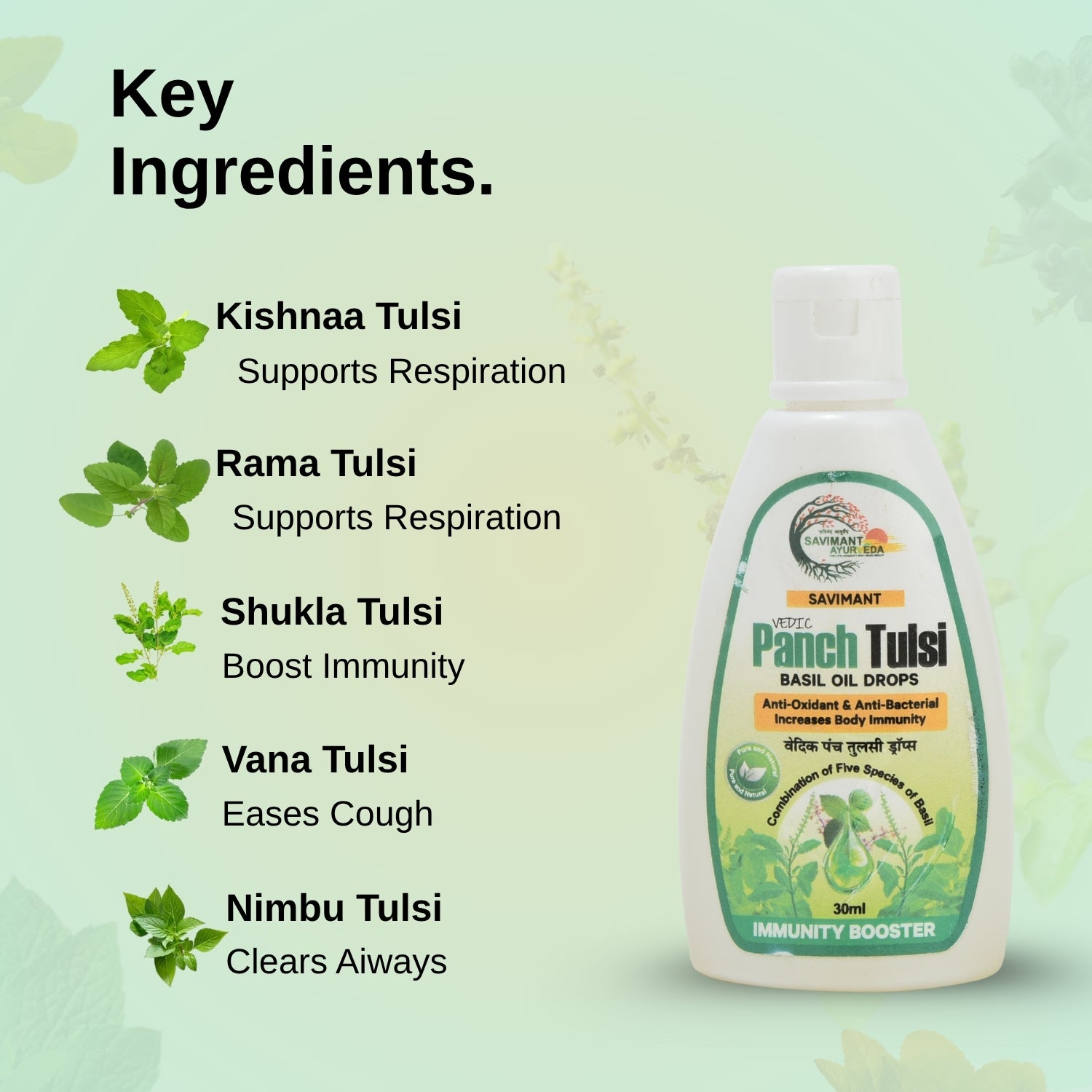 Savimant Vedic Panch Tulsi Basil Oil Drops are a unique Ayurvedic formulation made from the extracts of five rare species of basil (Tulsi), known for their powerful healing properties. These herbal drops act as a natural immunity booster, helping the body fight infections, colds, and seasonal flu. With strong antioxidant and antibacterial properties, Panch Tulsi supports overall wellness by enhancing the body’s defense system. Regular use of these herbal Tulsi drops not only strengthens immunity but also supports respiratory health by easing cough, sore throat, and congestion. It works as a natural detoxifier, cleansing the body from within and promoting healthy digestion, improved metabolism, and increased energy levels. How to Use: Add 2–3 drops of Savimant Panch Tulsi in a glass of water, tea, or juice and consume twice daily. You can also add it to warm water in the morning for natural detox or mix with green tea for enhanced benefits. These drops are versatile and can also be used for oral care and skincare. This 30ml bottle is easy to carry and use, making it perfect for daily health routines. Free from harmful chemicals, preservatives, or artificial flavors, Savimant Panch Tulsi Drops are safe for men, women, and even elderly individuals for daily consumption. Whether you are looking for a natural immunity booster, a herbal solution for cough and cold, or an everyday detox supplement, Savimant Vedic Panch Tulsi Drops is the perfect Ayurvedic choice for a healthier lifestyle.